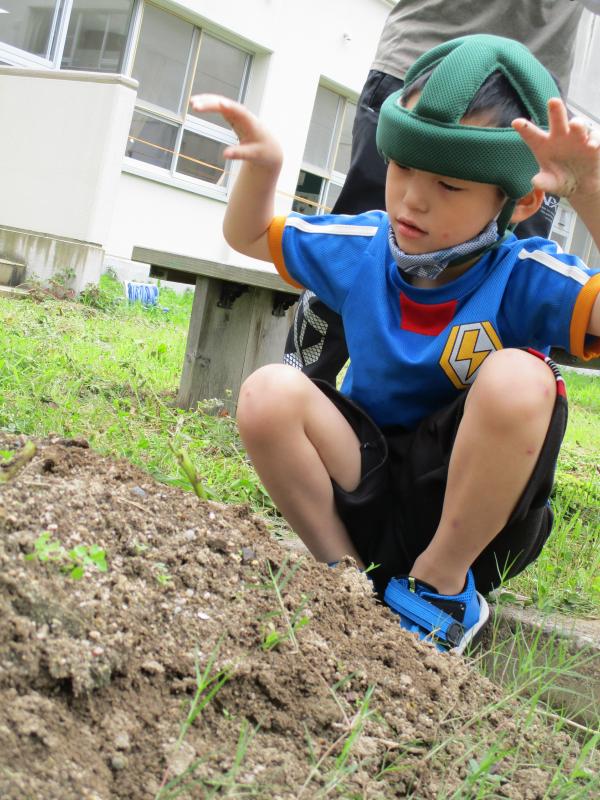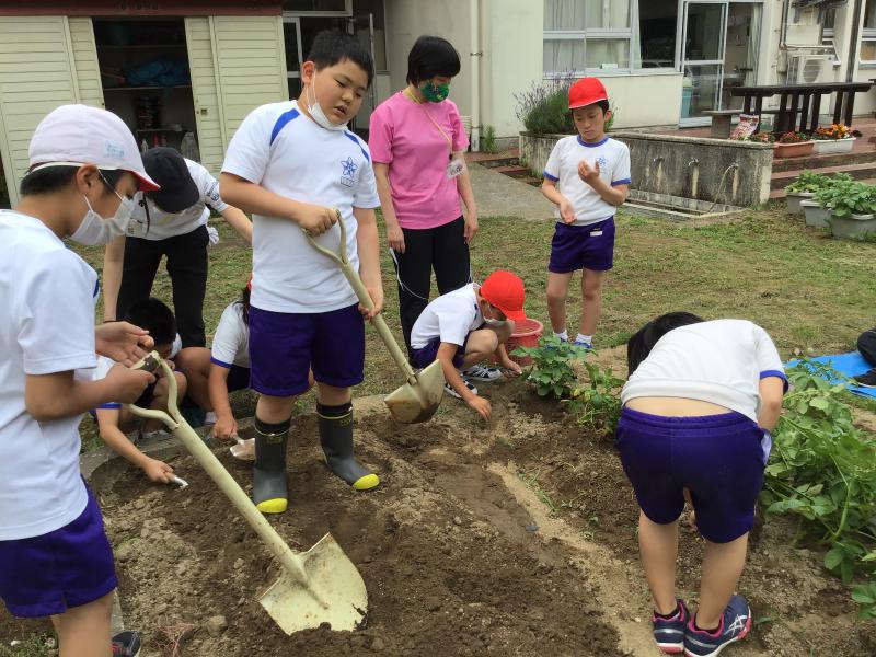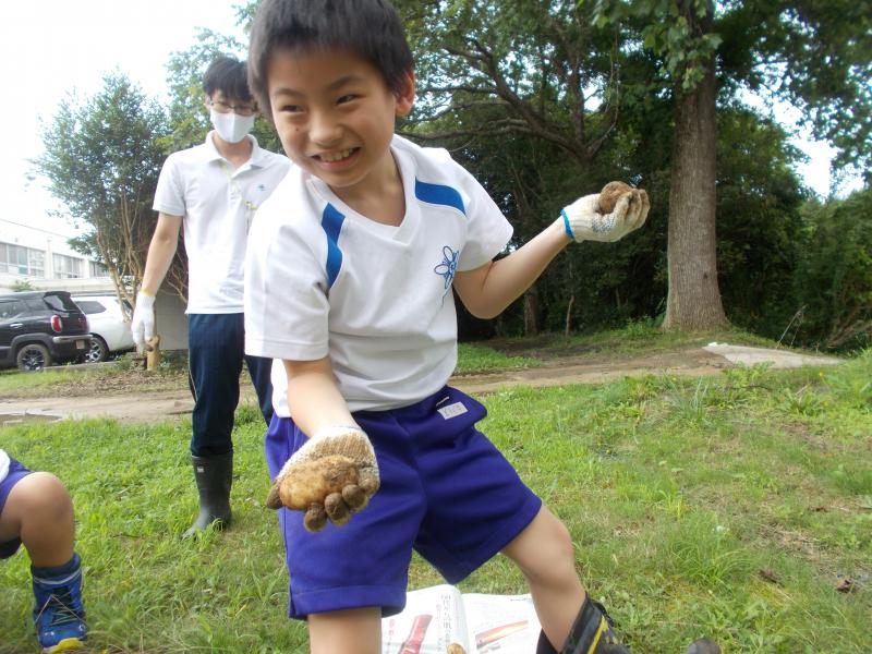 7月 今年は雨模様の日が多く、みんなのジャガイモはどれだけ大きくなったか、少し心配でした。各学年で収穫したところ、心配も何のその!きれいな形のジャガイモがゴロゴロ、ごろごろ。残念ながら、コロナウイルス感染予防のため、学校内で調理学習をすることができませんでしたが、お家でジャガイモは何に変身しましたか?コロッケ?カレーライス?ポテトサラダ? お味は?