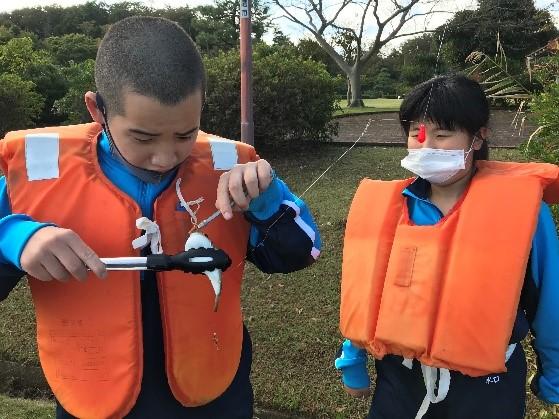 1時間半程、みんなで釣りをした成果は・・・ヒイラギ2匹とフグ2匹、そしてタコ1匹を釣ることができました!!カゴに自分で餌を入れたり、糸を垂らして魚が針にかかるまで、じーっと待ったりと普段学校ではできない体験をすることができました。