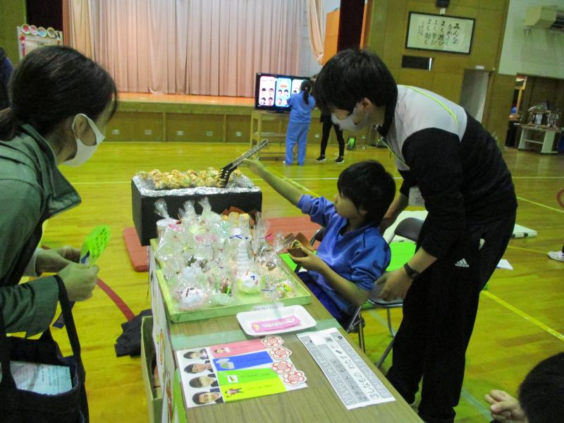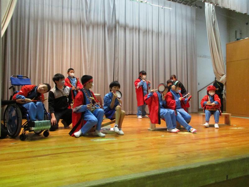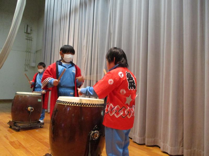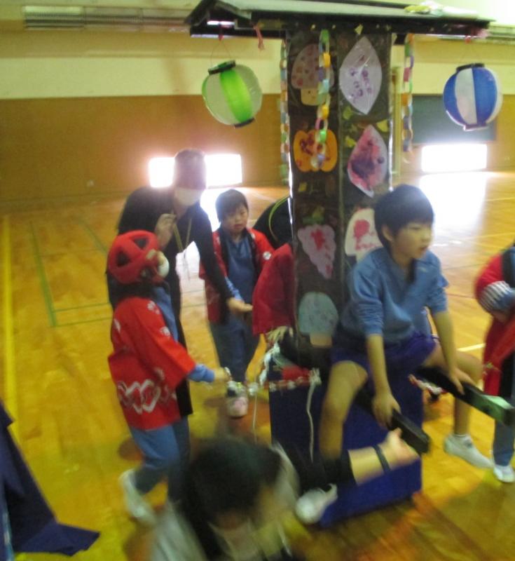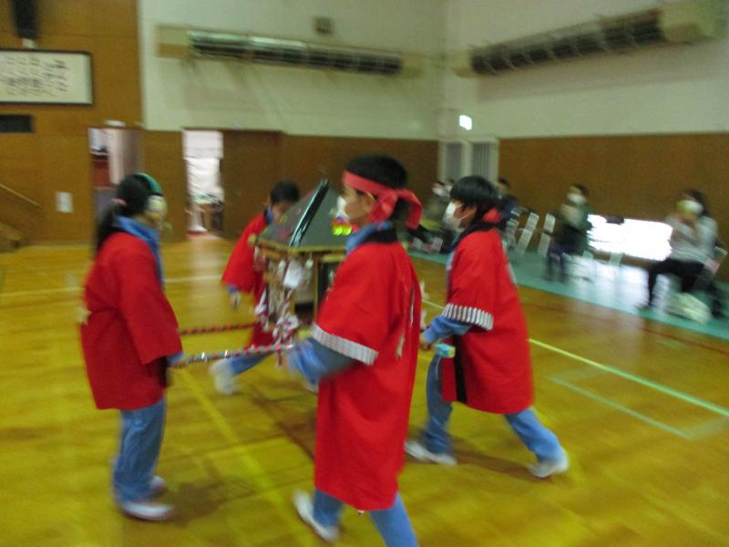 学習発表を兼ねて「秋祭り」をテーマに、神輿、太鼓演奏、おみせやさん、ダンスのプログラムを行いました。図工で取り組んだ芋スタンプで飾った神輿2基で練り歩き、音楽の授業で練習した「むらまつり」をステージで発表しました。食べ物屋、お面屋、まとあて屋では紙で作った商品を売ったり、作った道具でゲームの運営をしました。保護者の方にも店員をしていただき児童がお店を楽しむことができました。