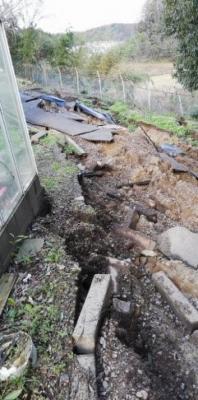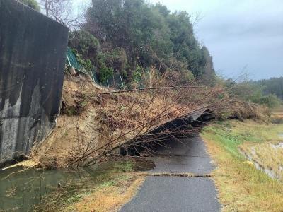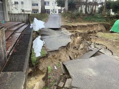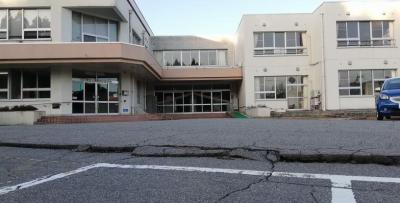 ・建物に大きな損壊なし。建物の安全確認済みである。敷地内のいたる所に地割れや沈下がある。学校裏側の擁壁が崩れ、学校裏側の損傷が大きく1m~3m程度沈下している。