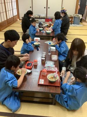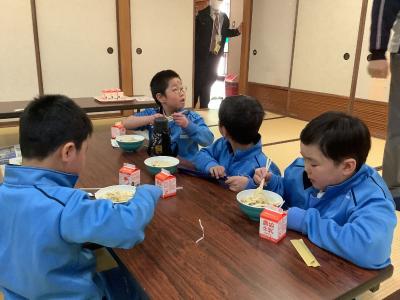 昼食提供スタート 2024年2月15日 07時30分 いよいよ待ちに待った温かい作りたてのお昼ごはん、小学・中学・高等部で日を決めてのの提供です。第1回目は小学部、メニューはうどんとフルーツ缶です。行儀よく座卓について友達といっしょに楽しく食べました。 いいね
