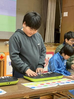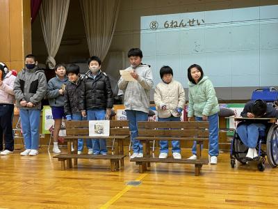 2024年3月4日 07時52分2月26日(月)に小学部の「卒業生おめでとう会」がありました。低学年は『シンコペーテッド・クロック』と『ピコピコパン』の音楽発表、中学年は『パズルゲームと』と『オー・シャンゼリゼ』の合奏、5年生は、『○×ゲーム』の出し物をしました。6年生からは卒業制作で作った『フラワーベンチ』の贈呈がありました。在校生からのプレゼント渡しでは、少し照れながらも6年生へ感謝の気持ちを込めて渡す姿が見られました。小学部6年生にとっても在校生にとっても思い出に残る楽しい会となりました。