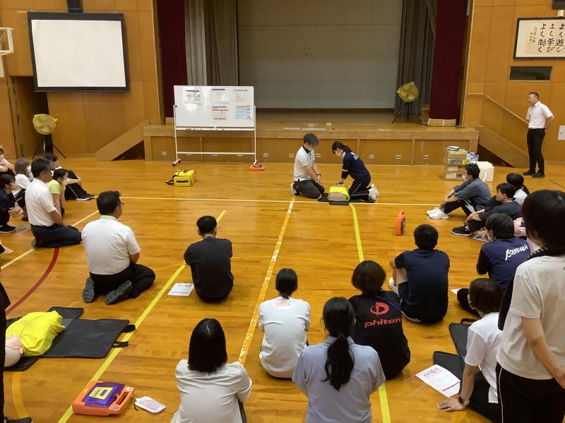 令和6年度第1回救急法講習会 2024年6月28日 16時18分 6月25日(火)に日本赤十字社石川県支部から講師を招き、教職員対象に救急法講習会を行いました。児童生徒の緊急時に備え、AEDを用いた心肺蘇生法や喉に異物が詰まった時の対処方法について実技を交えながら学びました。 いいね