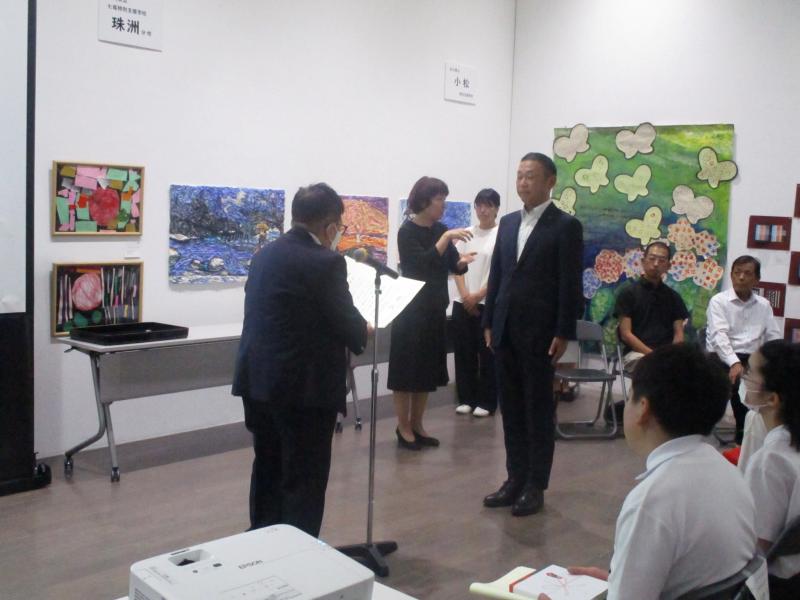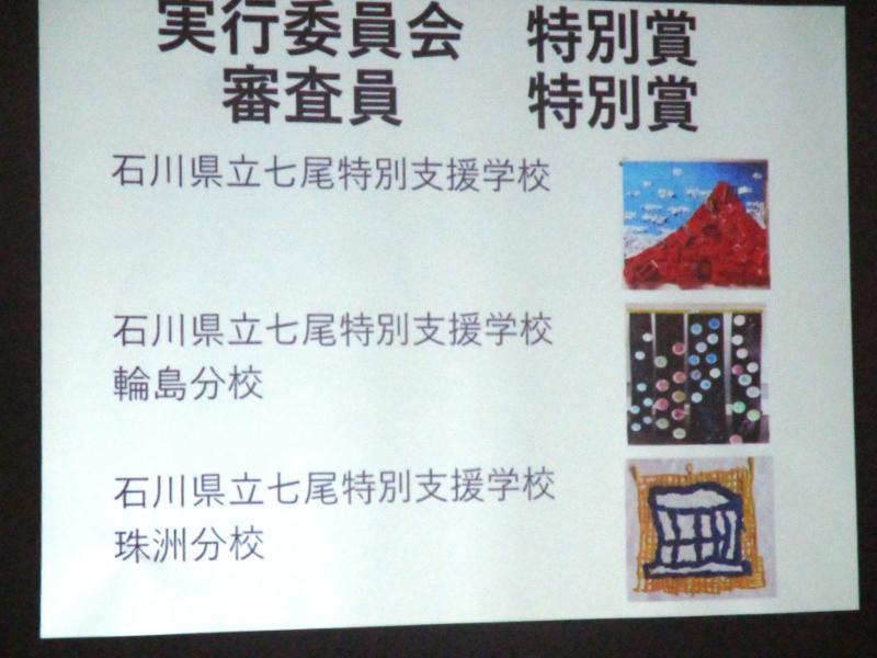 8月4日(日)には表彰式がありました。本校作品の入賞はなかったものの、1月の能登半島地震で被災しながらも、たくさんの力作を出品した本校・輪島分校・珠洲分校が、実行委員会特別賞と審査員特別賞をいただきました。