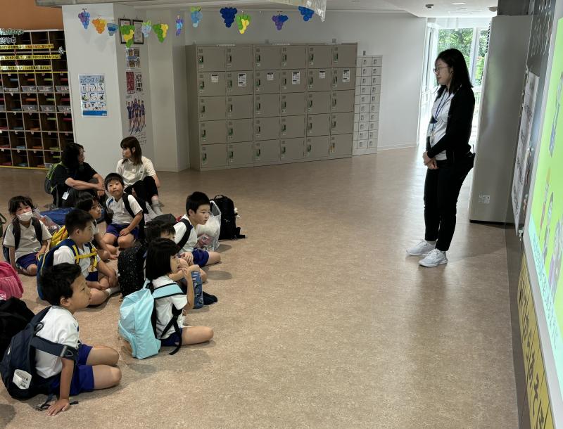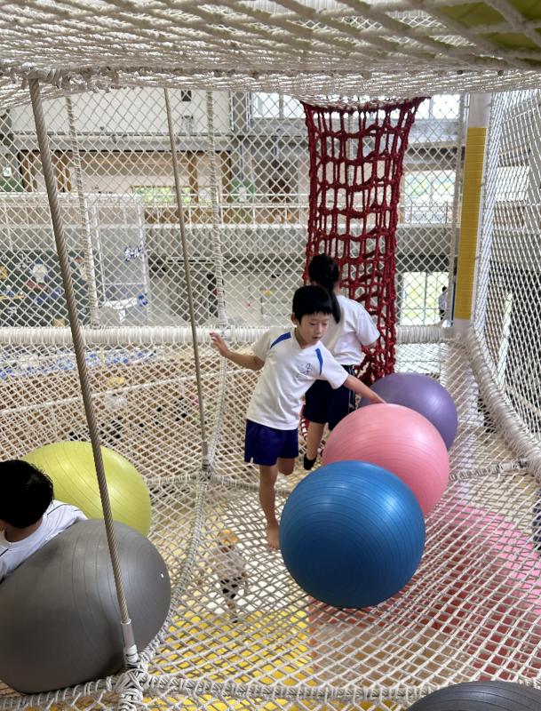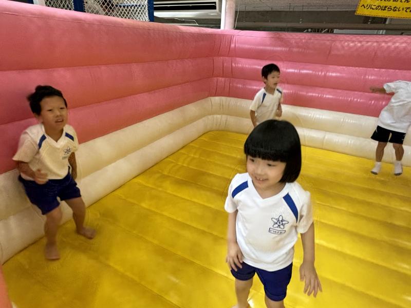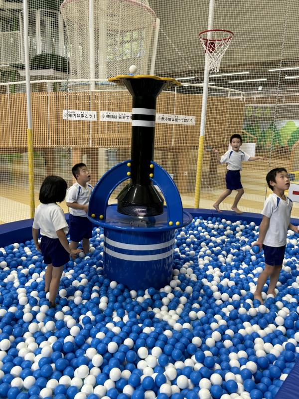 公共施設の利用方法やマナーを学んだり、決まりや約束を守って室内遊具で友達と楽しく遊んだりしました。遠足に来ていた志賀小学校の1年生や一般の幼児に交じって体をたくさん動かして楽しむことができました。