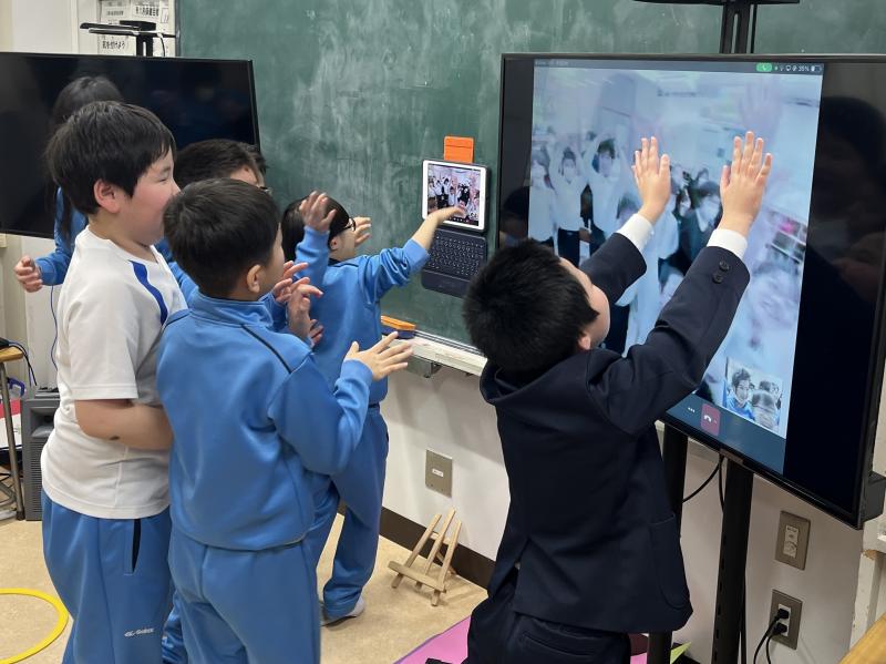 朝日小学校とビデオ通話で繋がると、お互いに目をキラキラさせて手を振り合っていました。子どもたちからは、たくさんの笑顔や「またしたいね!」と声を掛け合うなどの素敵な姿が見られました!