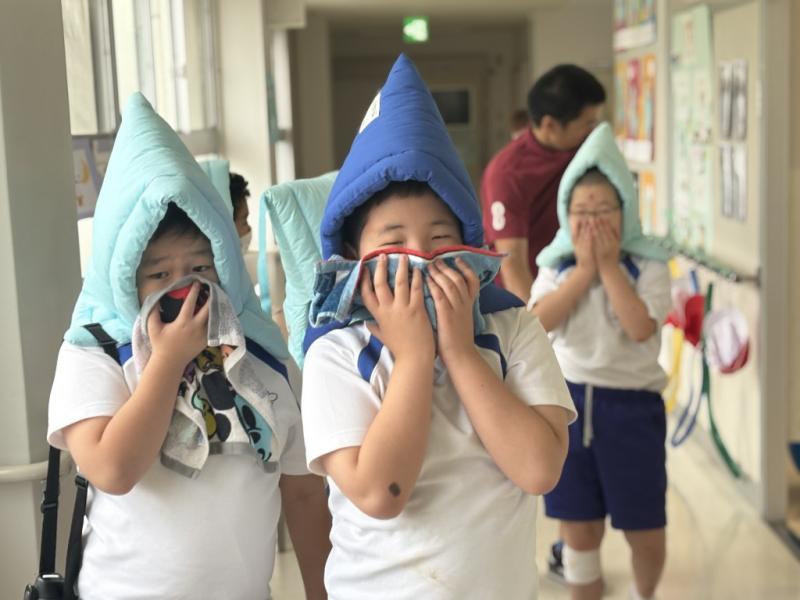 実際の訓練では、児童生徒は、机の下に入ること、防災頭巾で頭部を保護すること、ハンカチや手で鼻と口元を覆うこと等、身を守るための行動をとり、落ち着いて避難することができました。