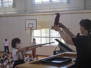次に校長先生のお話です。1~6年生まで1学期の成長を認め、よかったところを「ナンバーワン賞」と紹介してくださいました。そして、2年生と5年生が声をそろえて詩の暗唱「あめのうた」「竹取物語」を披露してくれました。