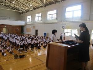 今日は1学期最後の日。4限目に全校児童が集まって終業式をしました。はじめに、県学童話し方大会と4年生器械運動交歓会の表彰の伝達です。