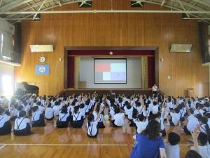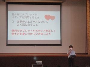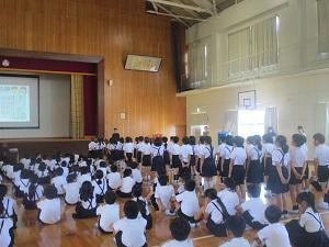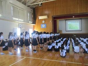 生徒指導とGIGA担当の先生からも、夏休みの生活とタブレットの使い方についてお話がありました。くれぐれもけがや事故、特に水の事故に気を付けてほしいことやタブレットの安全な使い方について全校みんなで確認しました。