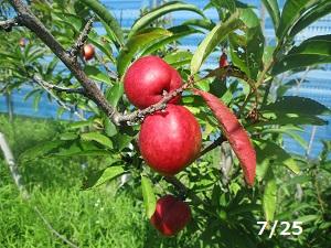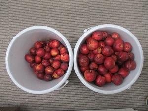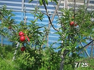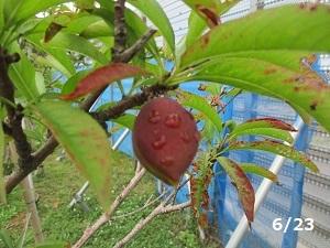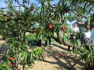 7月25日から、七塚小学校は夏休みに入りました。夏休み初日、学校の駐車場横の木津桃の実を収穫しました。