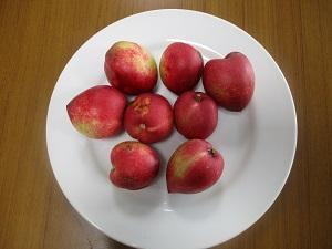 以前紹介した時にはまだ色も濃い紫色で身も小さかったのですが、収穫時期を迎えた木津桃はツヤツヤになり真っ赤に実っています。とても甘酸っぱい いい香りがしました。25日は8個、今日26日は3個とこれから徐々に収穫していきます。2学期まで冷凍しておき、6年生が木津桃について学習した後、ジャムづくりをする予定です。どれだけ収穫できるか楽しみですね。