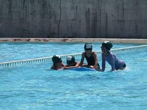 プール開放の参加者は、なんと128人‼ たくさんの子供たちが元気な笑顔を見せてくれました。様子を見ていると、やはり20分近くたつと子供たちが気づかないうちに、どんどん頬も紅潮してきました。そこで急遽15分の入水時間で5分休憩し水分補給という方向に切り替えました。