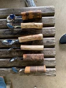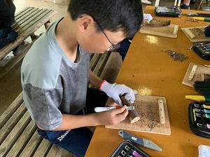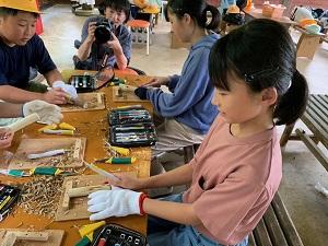 午前中は、マイスプーンづくり。木の枝をちょうどよい大きさに切って、模様を彫刻したり、焼き目を付けたりして世界に1つしかないオリジナルスプーンを作りました。その後は野外炊飯でカレーを作りました。そして自分の作ったスプーンで食べました。
