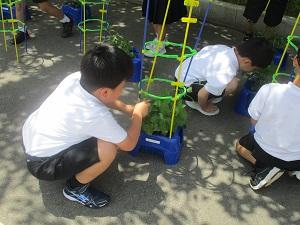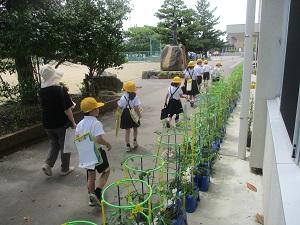 6月もあっという間に最後の週です。今日は久しぶりに夏の暑さを感じる一日となり、たくさんの学年がプールでの学習に取り組みました。また1年生は、育てているアサガオにつるが伸びてきたことを見つけ、支柱を立てることにしました。夏ならではの学習を楽しんでいる七塚っ子です。