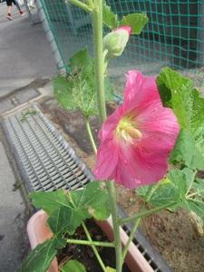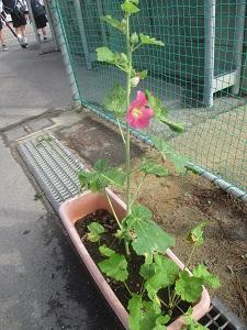 今日もとても暑い一日でしたね。今朝校門から玄関につながる道に置かれたプランターに、タチアオイが大きな花を咲かせました。地域の方が子どもたちのために植えてくださったお花です。本当にありがとうございます。