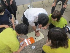 今回は養護教諭の指導のもと、心肺蘇生とAEDの研修会を行いました。プールに限らず、心肺蘇生やAEDは、人の命を救うための大事な研修だということを理解し、教職員全員が、真剣に取り組むことができました。