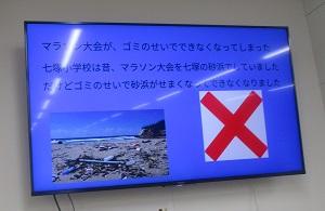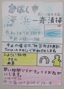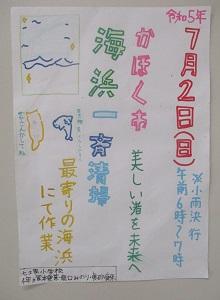 4年生は、総合的な学習の時間にを中心に「未来につなげよう、七塚の海」をテーマに、課題をもち、調べ学習を進めてきました。そしてこのままでは七塚の海がとてもピンチだとわかり、七塚の海を守るために一人でも多くの人に協力してほしいと考え、かほく市海浜一斉清掃への参加を呼びかけています。