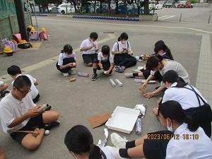 北陸地方も昨日梅雨入りしたこともあり、朝からどんよりとした曇が空を覆っていましたが、七塚っ子は、今日も元気です。今日の6限目は、久しぶりのクラブ活動でした。家庭クラブは今日はお茶の先生に来ていただき、高松の神保さんという和菓子屋さんの上生菓子「水鳥」をいただきながら、お茶会をしていました。お作法もさることながら、このような伝統文化に触れる機会はとても大切ですね。また、プログラムクラブでも石川高専の学生さんに来ていただき、プログラミングを中心に楽しむことができました。どんどん上手になって、自分たちでゲームを作れる日も近いことでしょう。サイエンスクラブは、アルミ玉づくり。1時間、ひたすらアルミ球を磨いて、ピカピカを目指していました。そのほかの音楽クラブ、バドミントンクラブ、卓球クラブ、ボールクラブ、ゲームクラブ、イラストクラブもそれぞれのクラブ活動を充実させていました。自分たちで計画し、自分たちで進めていくクラブ活動。これからも主役は、皆さんです