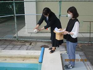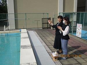 1限めに校長先生、教頭先生、田中先生で、今年のプールが安全に実施されることを祈願してお清めをしました。