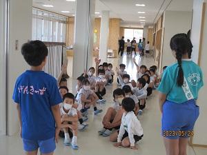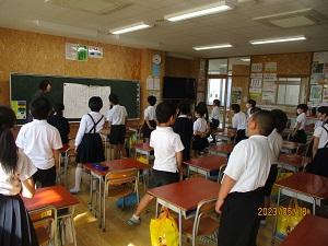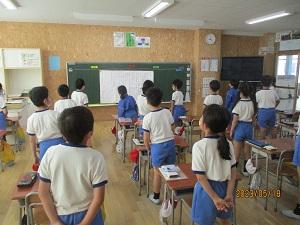 今日は水曜日、朝はげんきっず体操でスタートです。オリジナル体操の後、3年生は広い2階の廊下を使って、雑巾がけリレーで体を動かしました。3年生は今月の歌も、朝の会のあいさつも、学校で一番元気な声を響かせています。今日も全力投球の3年生です