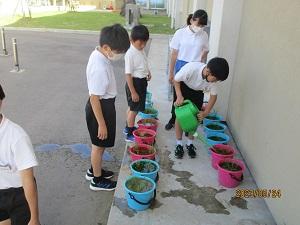 1学期は、多くの学年でいろいろな生き物を育てながら学習を進めています。1・2年生は生活科でアサガオやミニトマトを中心とした野菜を育てています。3年生は、理科でモンシロチョウ、ホウセンカなどの花々を育てています。モンシロチョウはちょうど今、さなぎになりそろそろ羽化を迎えています。5年生は、なかなか見に行けない田んぼの様子を想像しながらバケツ稲を育て、稲刈りまでの稲の様子を実感しようと頑張っています。