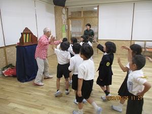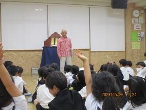 金沢市在住で全国でもご活躍の野間成之さん(通称のまりん)をお招きして、1年生と6年生が紙芝居を楽しみました。今年82歳ののまりんさんですが、全身を使って歌あり踊りあり、パワフルに熱く熱く語りかけてくださいました。1年生はもちろんですが、6年生も「のまりんワールド」にぐいぐい引き込まれていきます。休み時間にも子供たちは、のまりんさんと語り合っている様子が見られ、とても微笑ましいひとときでした。