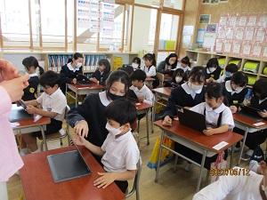 1年生は、ひらがなもだいぶ覚えてきました。今日は6年生にタブレットの使い方を教えてもらいました。わんぱくグループ(縦割り班)のお兄さんお姉さんとペアを組んで、ログインの仕方や充電の仕方などの基本的なことから、写真の撮り方見方も学ぶことができました。