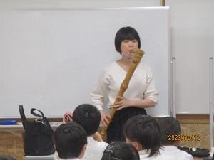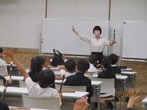 3年生の音楽科では、初めてリコーダーを学習します。今日は東京リコーダー協会からお越しいただいた井川先生に、リコーダーの魅力についてたくさん教えていただきました。3年生が学習するのは「ソプラノリコーダー」ですが、たくさんの種類のリコーダーがあることを知り、その音色の違いにも気づかせていただきました。また、タンギングの大切さやタンギングが上手になるための練習の言葉、リコーダーを吹く時の姿勢や持ち方などの基本も教わることができました。井川先生は、「リコーダーを吹くときに一番大切なのは、心です。どんな曲か心を働かせて想像し、指遣いや息の使い方だけでなく、楽しむ心を忘れないでください」とおっしゃいました。3年生の皆さん、これからも心を大切にして練習してくださいね。