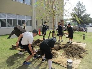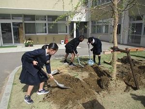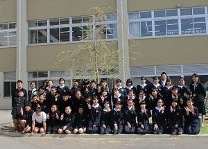 明治6年7月4日にこの七塚小学校が創立してから150年。今年度は、七塚小学校創立150周年の記念すべき年です。今日は、その記念行事の一つとして、植樹祭をしました。4メートルのしだれ桜に、6年生一人一人が、いろいろな願いや思いを込めて、土をかぶせました。これから、このしだれ桜が根付き成長していくように、子供たちと七塚小学校がさらに発展し、新しい歴史を刻んでいくことを願っています。