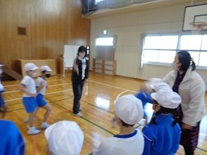 今年の干支、兎年にちなみ「うさぎうさぎ なんで耳が長い?」という手遊びでスタート、「校長先生の声をよく聞くため~」「おうちの方の声を聞くため~」など色々なバリエーションで、子どもたちはそれぞれの兎に変身していました。