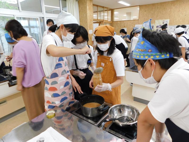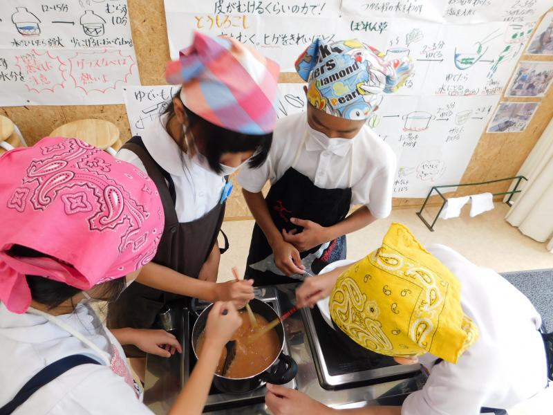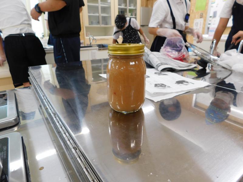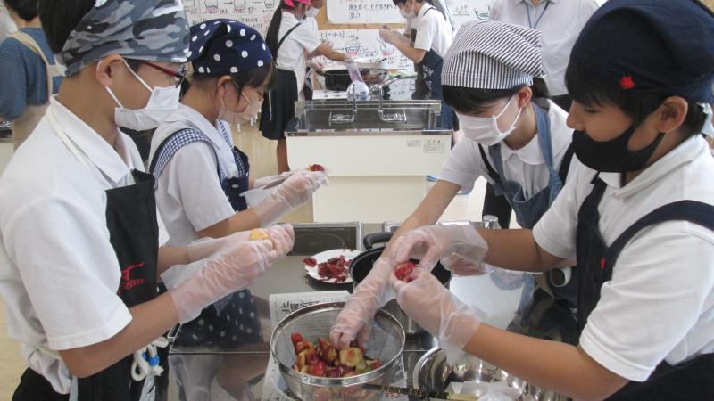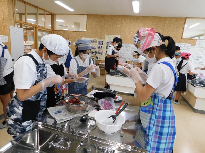 4月から水やりのお世話をしてきた木津桃の実でジャムを作りました。学校の実だけでは足りず,ご近所の西谷さんよりたくさんの実をいただきました。種を取り,皮をむいて,砂糖を加えて煮込むと,甘酸っぱい香りが家庭室いっぱいに広がりました。むいた皮を一緒に煮込むことできれいなピンク色のジャムに仕上がりました。