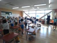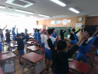 今日からげんきっず体操が始まりました。体力向上を目指して、毎週水曜日の朝学習の時間に、げんきっず委員会がお手本となって、全校で取り組んでいます。げんきっず体操が終わった後は各クラスでそれぞれ体力アップにつながる運動をしています。腕ずもうや8の字跳び、進化ジャンケンなど、どのクラスも工夫して楽しく体を動かしていました。