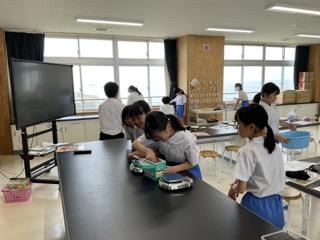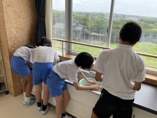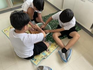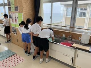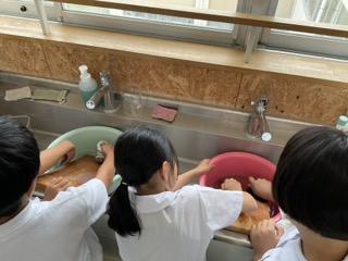 家庭科「夏をすずしく さわやかに」の学習で、手洗いの仕方について学びました。「もみ洗い」「つまみ洗い」「ねじりしぼり」などの洗い方や乾きやすい干し方を確認してから実践しました。また洗剤や水の量を計算し、電子ばかりやビーカーを使って測りました。洗濯後はテラスに干しました。靴下や敷物の準備をありがとうございました。おうちでもできるといいですね。