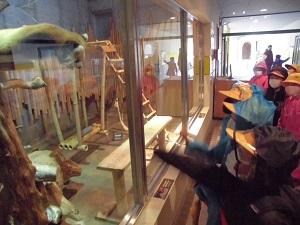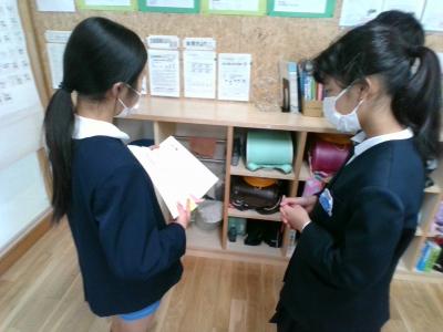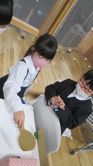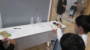 4年生の作品を見ながら話を聞いている5年生が