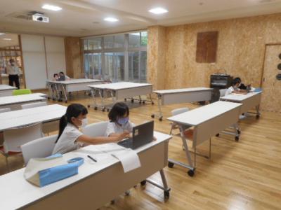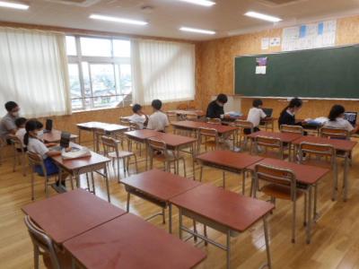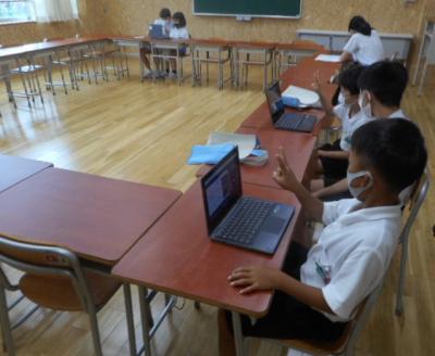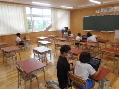 2021年9月10日 10時50分オンライン授業に備えて、1年生が6つの教室に分かれて、タブレットを使った授業の練習をしました。6年生に手ほどきを受けながら、上手に操作することができました。授業の後半は教師から動物クイズが出され、楽しそうに答えていました。