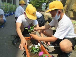 「人権の花運動」とは、命ある花をみんなで協力して育て、命の大切さをわかってもらう運動です。環境委員会が学校の代表として、プランターに植えました。今年は,「マリーゴールド」「ベチュニア」「インパチェス」「ベゴニア」の4種類の花を植えました。今日植えた花は,玄関の前に置いてあります。花を見て,自分も周りのみんなも大切にしたい、と感じてくれたらと思います。