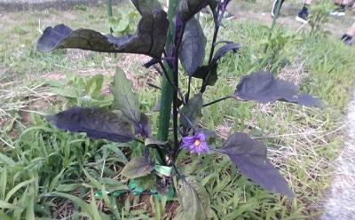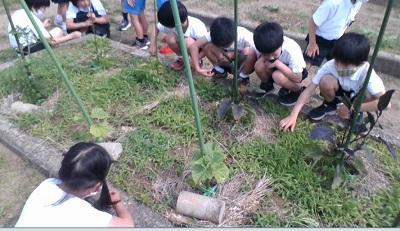 草むしりのあとに観察をすると、キュウリとなすの花がさいていました。なすの花を初めて見る児童もいたようです。