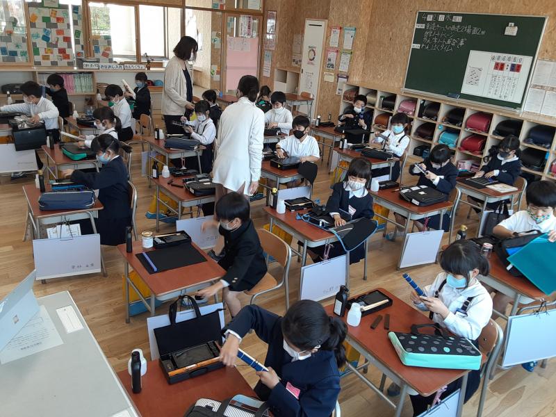 3年生が初めての毛筆習字の時間に習字セットを扱いました。2年生までは鉛筆の習字だったのです。