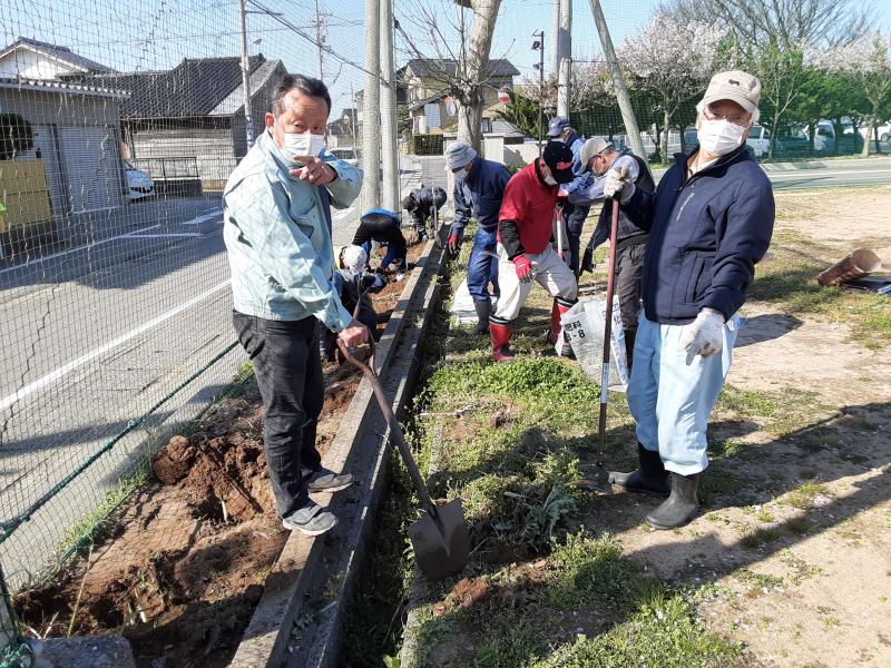 4月10日の朝、井口さんをはじめ10名の有志の方々が道路沿いの花壇にかんなカンナの球根の植え付けをしてくださいました。 声をかけると「私ら団塊の世代、まだまだ若いもんには負けん。元気元気!」と、皆さんはあふれる笑顔で答えてくださいました。