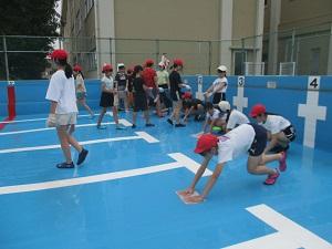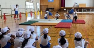 今まで身につけた技を組み合わせてグループごとにマット運動の演技をしました。校歌に合わせて、どんな技をどのように組み合わせればいいのか、グループで相談しながら練習をしてきました。今日はそれを1年生に見てもらいました。校歌を歌いながら見てくれたり、感想をたくさん言ってくれたりして、6年生はとても嬉しそうでした。発表後は一緒におにごっこをしました。
