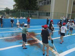 プール掃除をしました。プールの改装工事が終わり,今年度から新しいプールとなります。プールの中にたまっていた砂や汚れを雑巾やスポンジを使って,きれいにしました。最後には,水をかぶって楽しそうにしている児童でした。七塚小学校の児童には,6年生がきれいにしたプールでたくさん練習してほしいです。