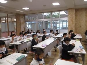 今日は,宇ノ気中学校の栄養士さんに食事のマナーについて教えてもらいました。正しい箸の持ち方をビー玉を使って実践したり,「ごちそうさま」の意味について教えていただいたりしました。お皿の置き方など,子ども達があまり知らなかったこともあり,真剣にお話を聞いていました。また,交差とびを教えてもらった時には,どうすれば引っかからずに跳べるのかをペアで考えながら跳んでいました。「教えてもらった後の方がたくさん跳べた!」という子もおり,これから頑張るぞと意気込んでいました。