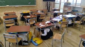 地震の放送の直後、児童は素早く机の下にもぐり、頭を守っていました。