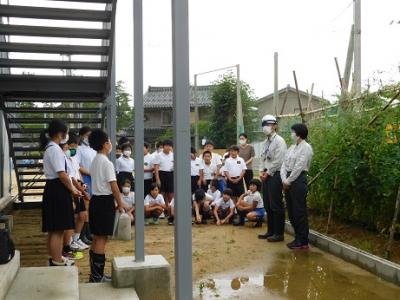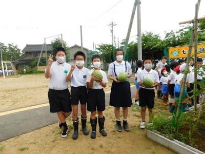 昨日は、6年生の企画委員が代表してスイカの収穫をして兼六建設の現場監督の由井さん、七キラ農園のお世話を続けてくださっている坂本さんに感謝の気持ちを伝えました。