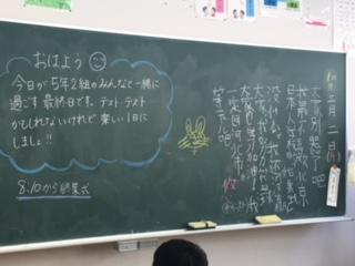 突然の臨時休業が決まり、子ども達も先生方も、寂しい気持ちで本日を迎えました。今朝は、教室の黒板に書かれた先生方のメッセージや楽しい絵が、子ども達を出迎えました。今年度最後の楽しい思い出を、みんなでつくってほしいです。