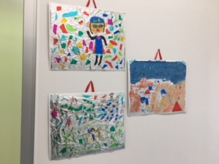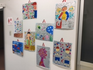 殺風景な仮校舎ですが、子ども達の作品や地域の方々の作品で、楽しい雰囲気をつくってくれています。