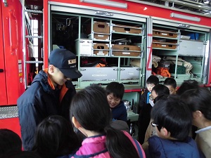 火事から生活を守るためにどんなお仕事をしているのかお話を聞いたり、実物に触れたりしながら学びました。見学の途中で救急車が出動し、あっという間に出動していく場面がありました。消防署ではたらく人たちが火事だけでなく、病気や怪我などからも私たちの生活を守っていることに気付けたようです。