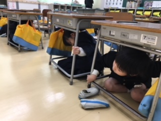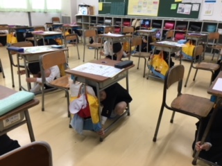 災害時における防災教育は、近年強化が進んでいます。本校でも、毎月いろんな災害を想定しての避難訓練を行っていますが、25日には、Jアラート・引き渡し訓練を行いました。緊急事態を知らせる警報が鳴ると、児童は素早く身の安全を確保する行動を行いました。