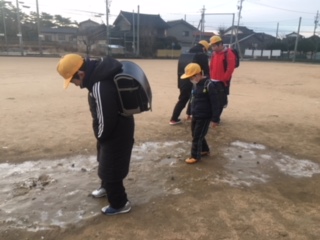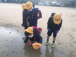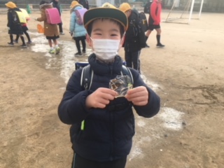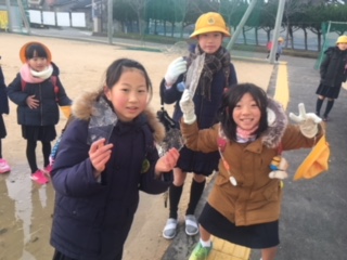 学校の運動場にも氷が張り、児童玄関が空くのを待つ間、子ども達は氷を触ったり割ったりと、楽しんでいました。暖冬と言われていますが、冬を感じることができた貴重な朝でした。